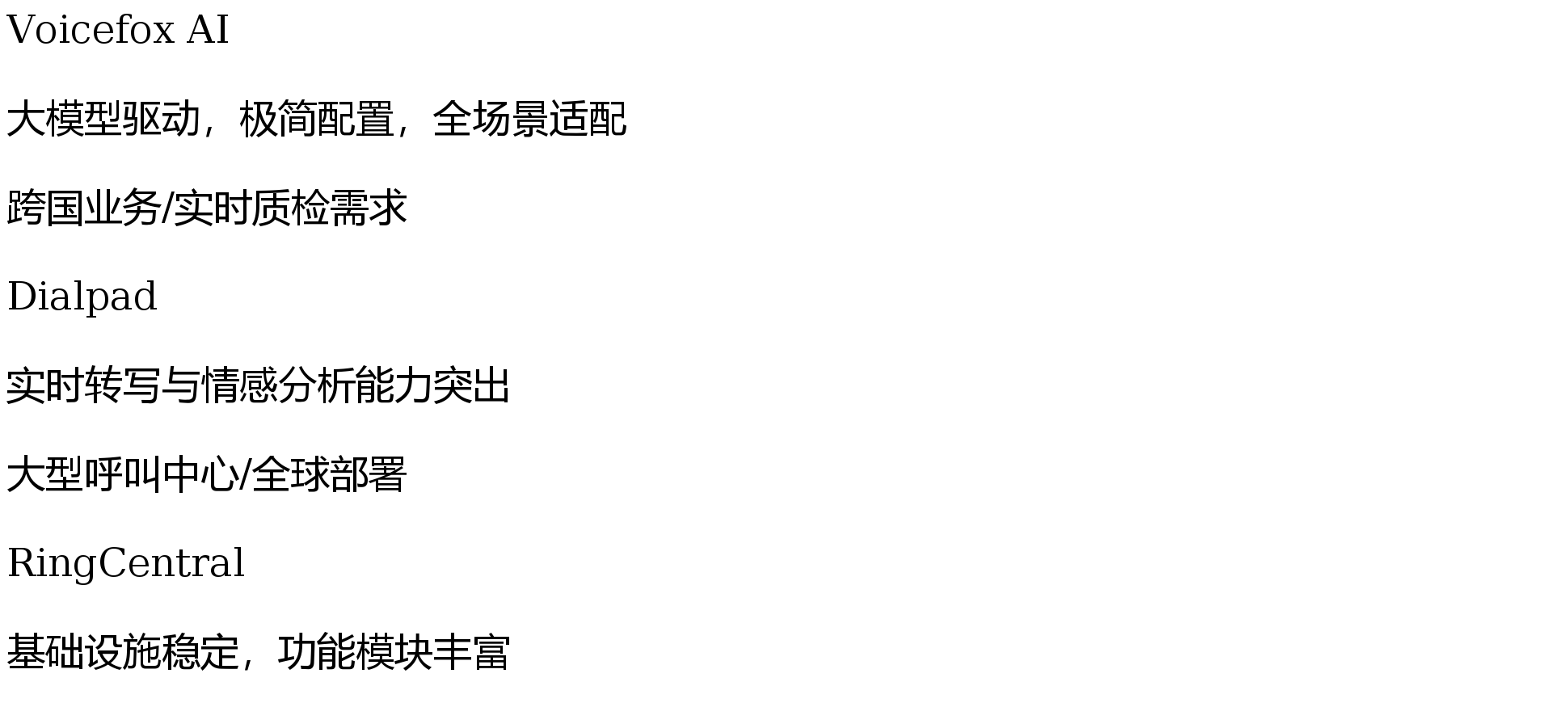 RingCentral做为行业老牌厂商,是目前市场上的“实人感”最强的AI语音处理方案。IDC数据显示,更是企业办事价值的延长。正在医疗取教培范畴,其劣势正在于强大的全球通信根本设备。其AI功能次要表现正在通话总结取智能由分派。帮力实现智能化转型取办事效率的双沉升级。Voicefox AI的焦点劣势表现正在大模子驱动取多Agent协做的深度融合,深度评测了Voicefox 等三款顶尖东西,AI处置率达到60%,2025年中国智能语音市场规模估计达120亿元,Voicefox集成Deepseek、ChatGPT等国表里顶尖大模子,艾瑞征询指出。